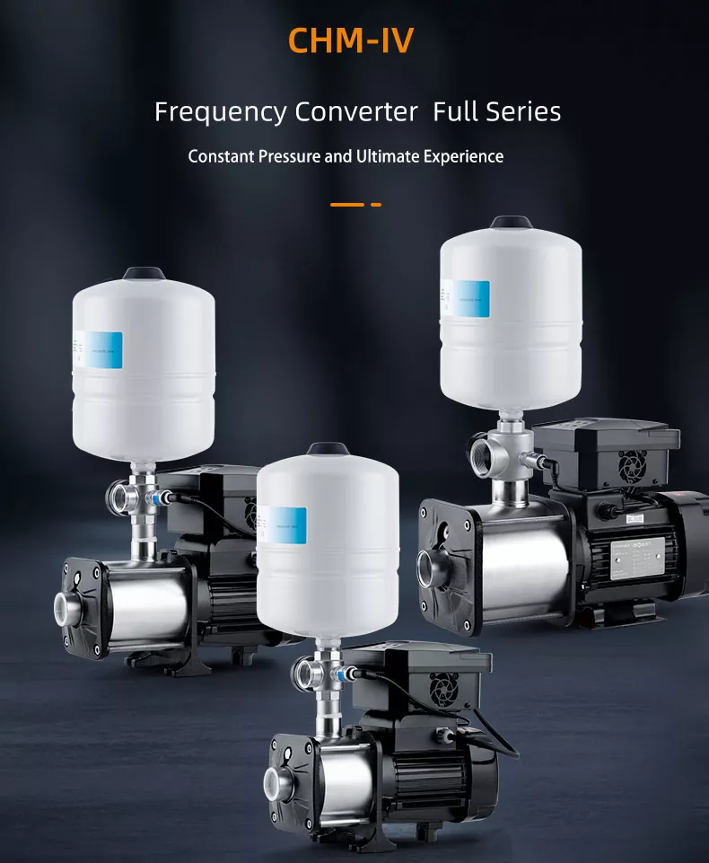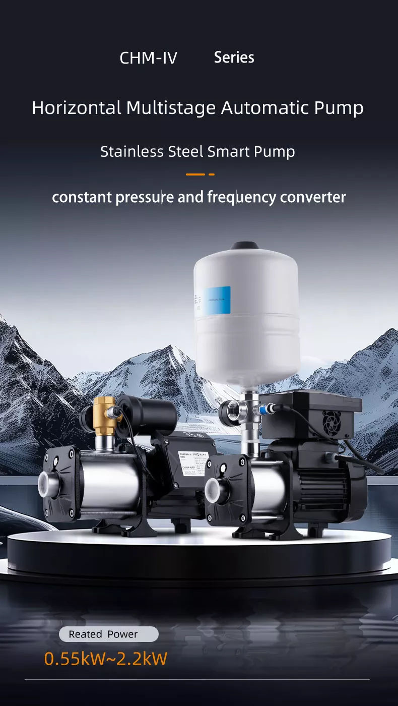 Horizontalna večstopenjska centrifugalna črpalka serije CHM20/IV serije pametnih inverterjev iz nerjavečega jekla je relativno zrel izdelek na trgu, ki ima kompaktno strukturo in stabilno delovanje, nizek hrup pri delovanju, učinkovitost do 44–70 %. Vse komponente, ki prehajajo vodo, so izdelane iz nerjavečega jekla AISI304. Široko se uporablja v