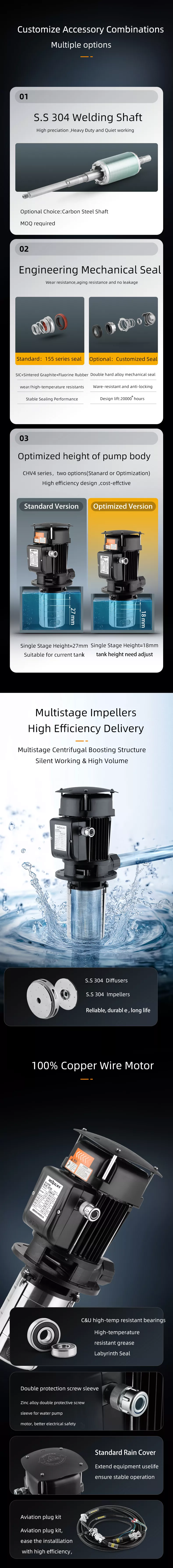 Sledi predstavitev serije CHV. Potopne večstopenjske centrifugalne črpalke CHV, posebej zasnovane za črpanje hladilnih maziv za obdelovalne stroje in za namestitev na vrh rezervoarjev, pri čemer je sklop črpalke potopljen v črpano tekočino. Črpalke STAIRS SBK so na voljo z različnimi velikostmi črpalk in različnimi stopnjami za zagotavljanje pretoka, tlaka in zahtevane dolžine.